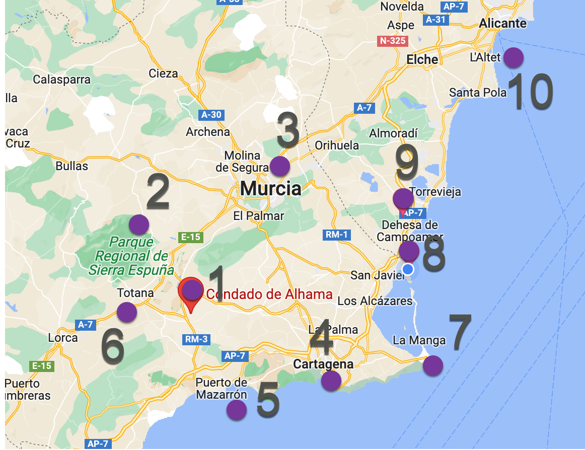 Distances from Condado de Alhama: Parque Regional de Sierra Espuña 28 km | Murcia City 49 km | Cartagena city 48 km | Puerto de Mazarrón 30 km | Totana 17 km | La Manga 71 km | La Zenia 77 km | Torrevieja 85 | Alicante airpor